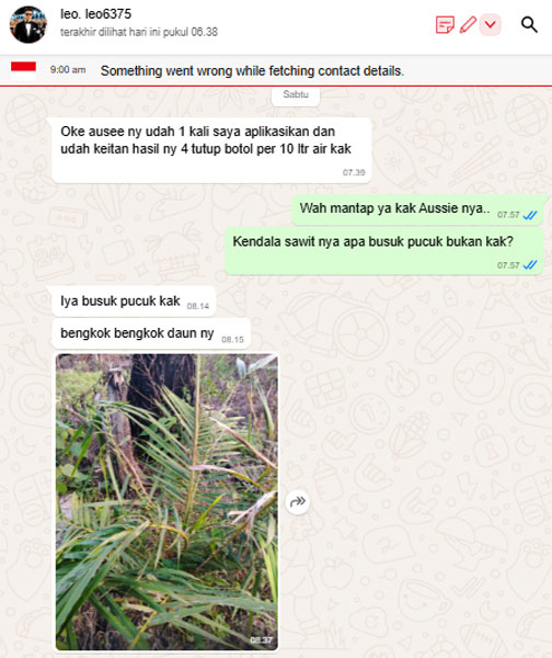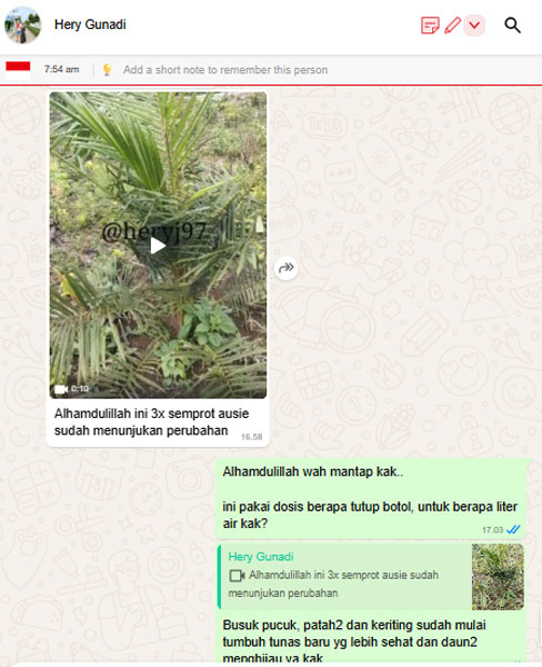 Dengan sisa harapan yang saya punya, lewat website itu saya mencoba memesan produk Aussie untuk membantu mengatasi jamur ganoderma di kebun kelapa sawit saya.