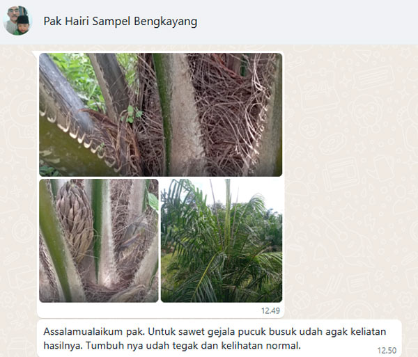 “Sawit gejala pucuk Busuk sudah gak kelihatan. Tumbuhnya sudah tegak dan kelihatan normal.”
